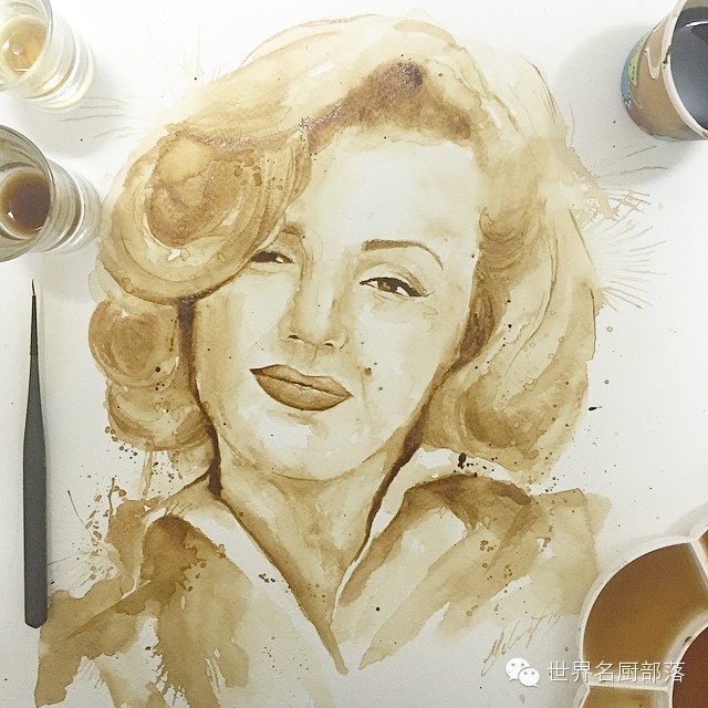 Maria A.Aristidou依照人物特性选用三到五种深浅度不一的咖啡,善用色彩浓淡营造出阴影渐层感,画完之后更飘散出淡淡的咖啡香,一次满足视觉与嗅觉的双重感受。非常适合一边喝咖啡,一边欣赏咖啡创作呢! 影集《怪医豪斯》中的休罗利 咖啡绘制的玛丽莲梦露,真是妩媚又动人呢!